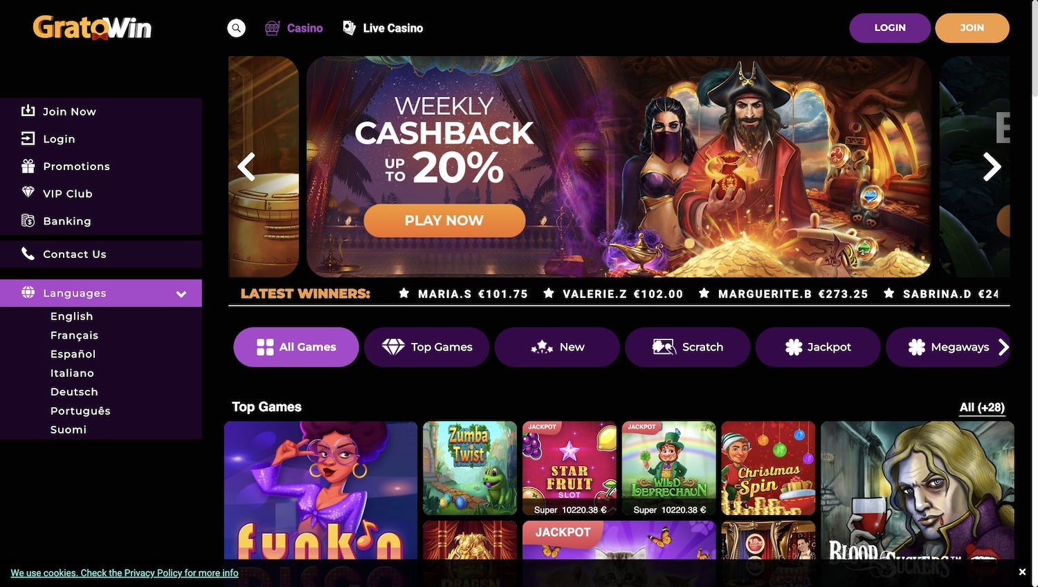 GratoWin ma nowoczesną stronę internetową, którą łatwo przeglądać. Oferuje gry od wiodących światowych producentów oprogramowania, atrakcyjne promocje dla nowych użytkowników oraz cotygodniowy cashback, który może sięgać nawet 20%.
